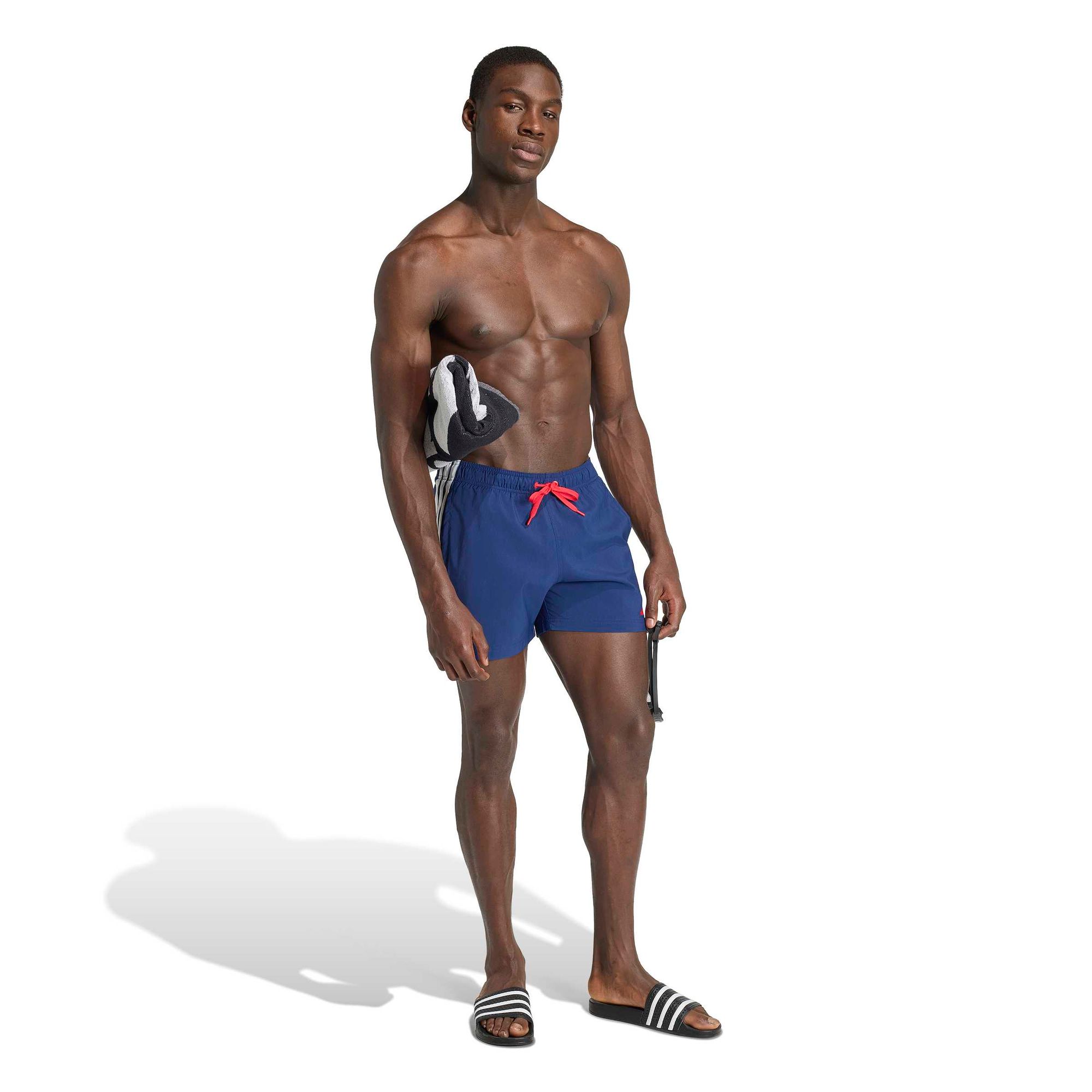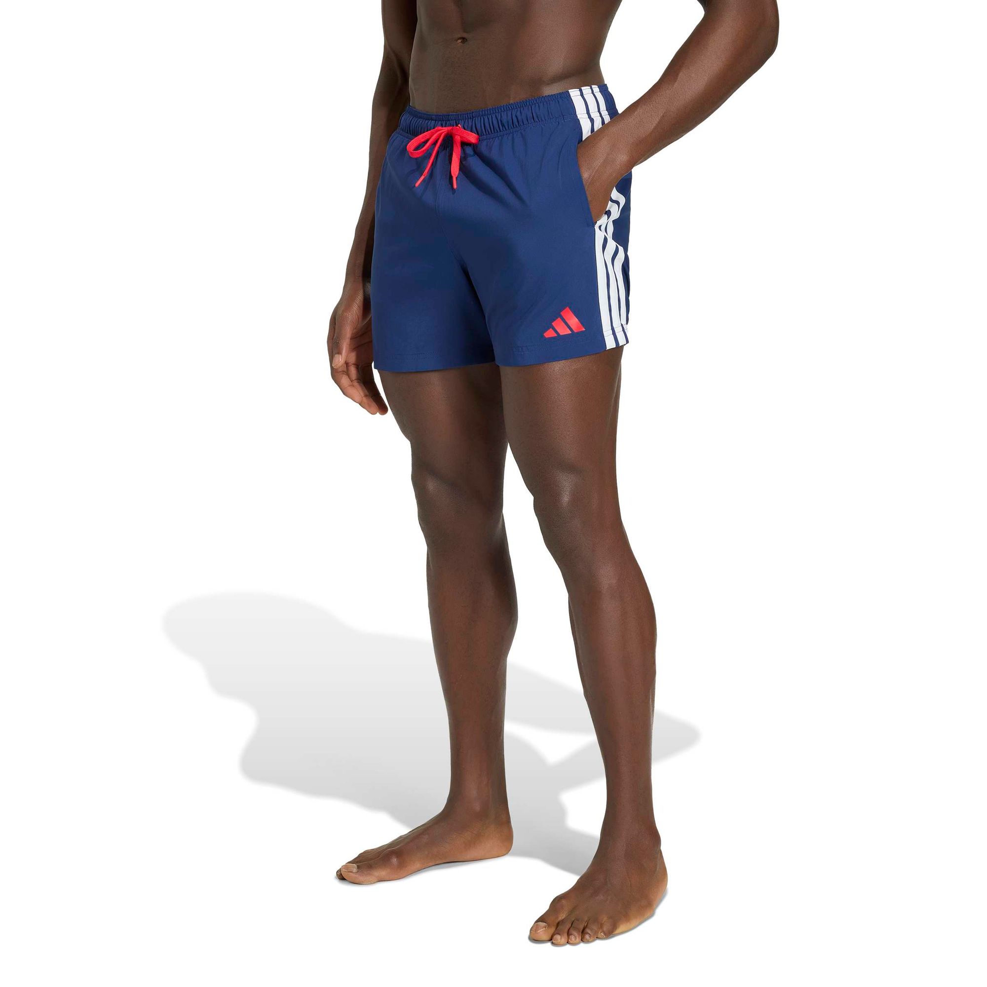 Mit praktischen Seitentaschen und dem ikonischen 3-Streifen Branding vereinen diese Shorts Funktionalität und Style. Die Badeshorts in regulärer Passform bieten die perfekte Balance aus Bewegungsfreiheit und Halt – eine vielseitige Ergänzung für deine Schwimmausrüstung.