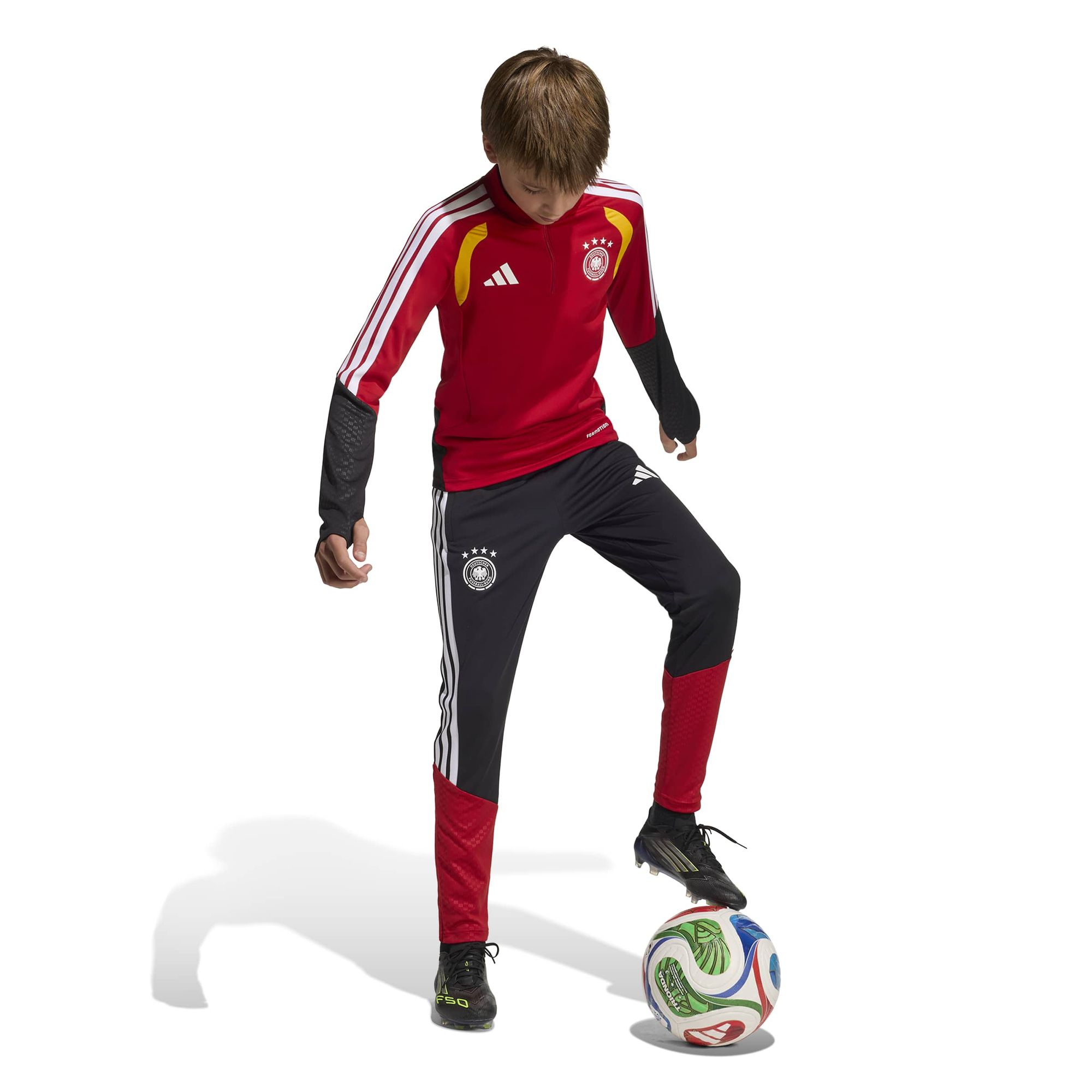 Das Modell hat einen sleeken Reißverschluss, der ein einfaches An- und Ausziehen während des Trainings ermöglicht. Das charakteristische Branding, einschließlich 3-Streifen Tape, setzt einen zusätzlichen stylishen Akzent, damit junge Fußballfans stilbewusst das Spielfeld betreten können.