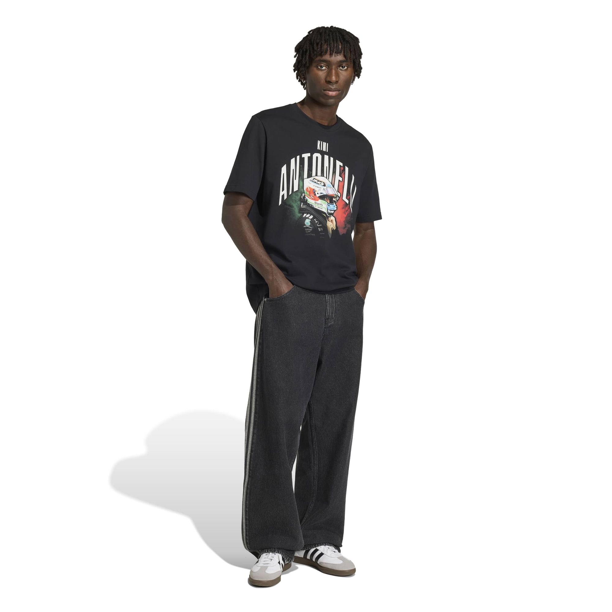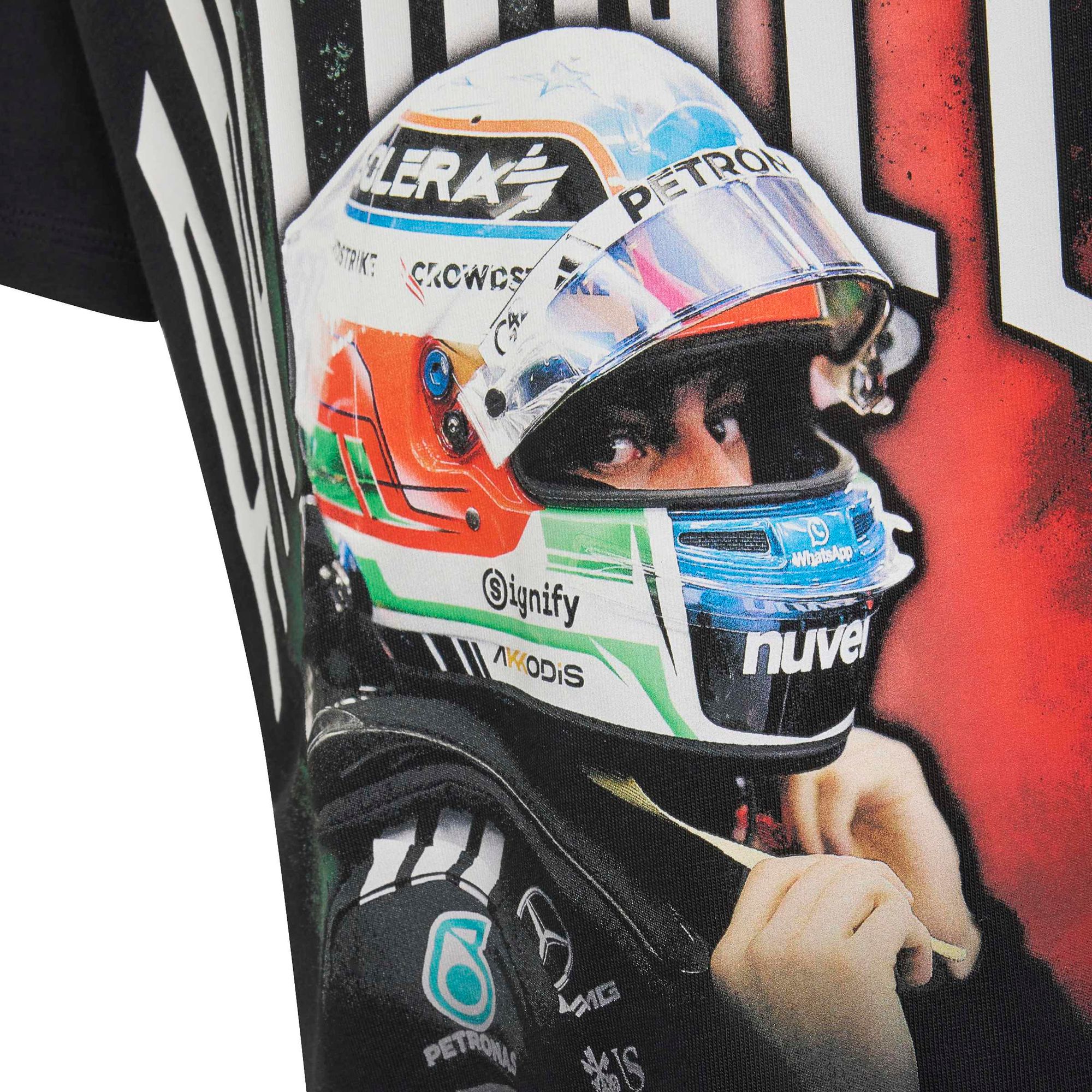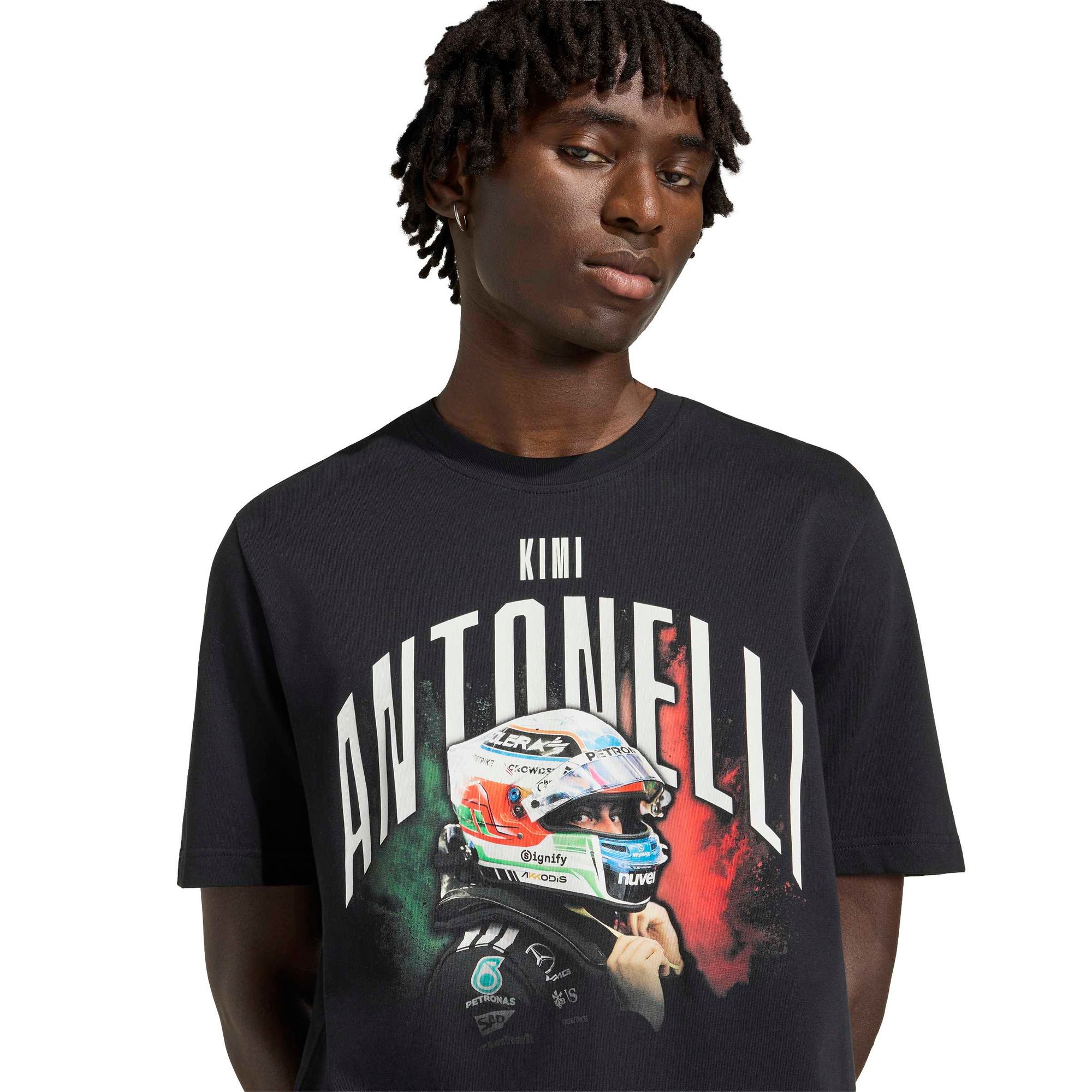 Das Grafik-Design zeigt Kimi Antonellis Namen und ein dynamisches Foto von ihm in seinem Fahreranzug mit Helm, das die Essenz von Geschwindigkeit und Nervenkitzel perfekt einfängt. Das aufgestickte 3-Balken Logo verleiht dem Shirt einen raffinierten Touch und macht es zu einer stilvollen Ergänzung deiner Garderobe.
