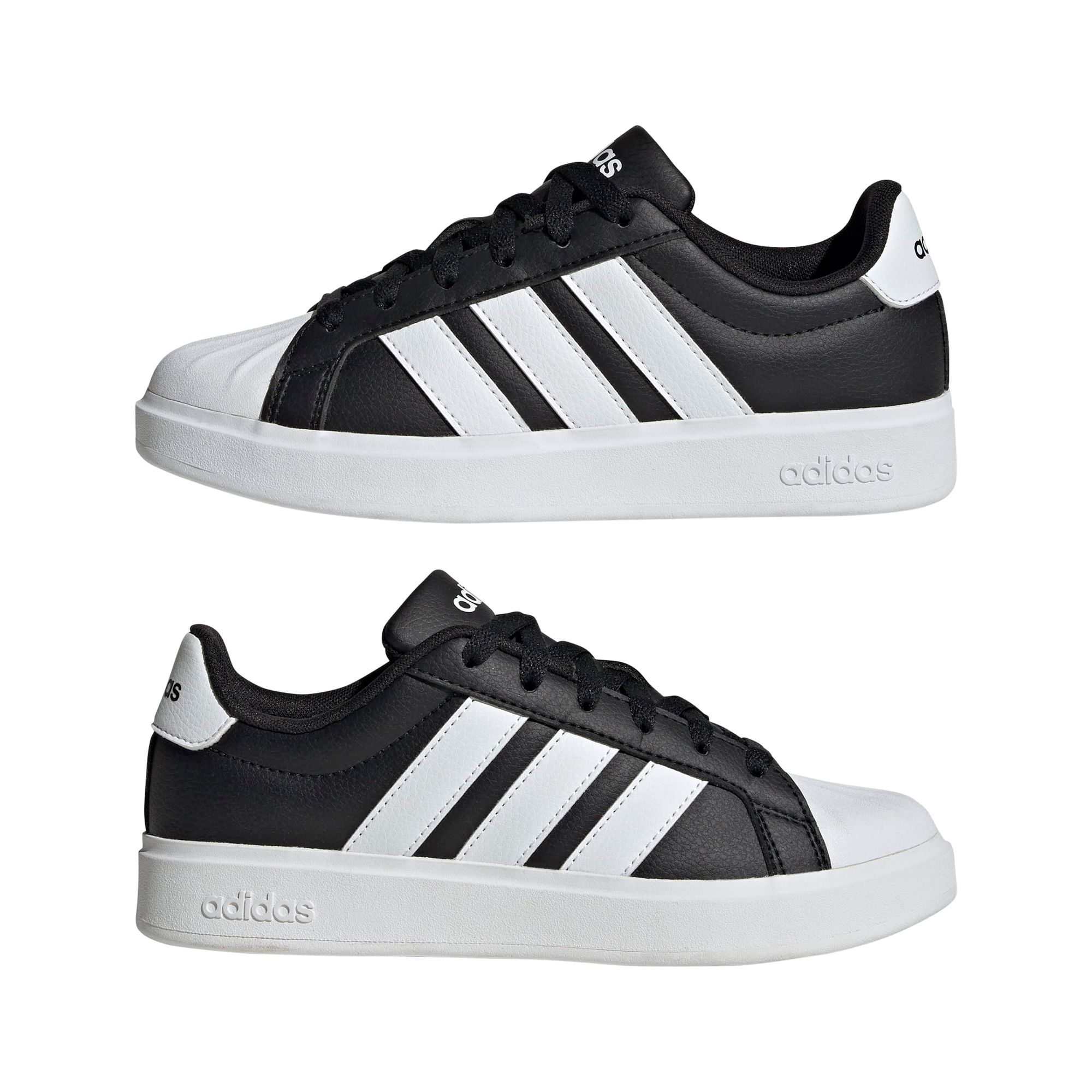 Ein Klassiker ist aus gutem Grund zeitlos. Seit mehr als 50 Jahren ist der adidas Superstar nicht aus der Mode wegzudenken. Jetzt ist der kultige Shell Toe-Schuh auch für die nächste Generation erhältlich. Diese Version für Kinder und Teens hat alle Eigenschaften des Originals, aber in kleineren Größen. Ein glattes Synthetik-Obermaterial und Textilfutter halten die Füße bequem, beim Abhängen mit der Crew oder beim Spaziergang.