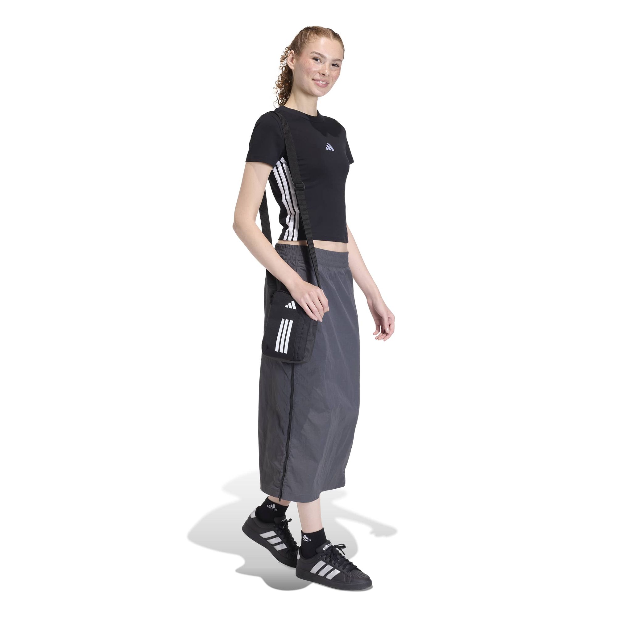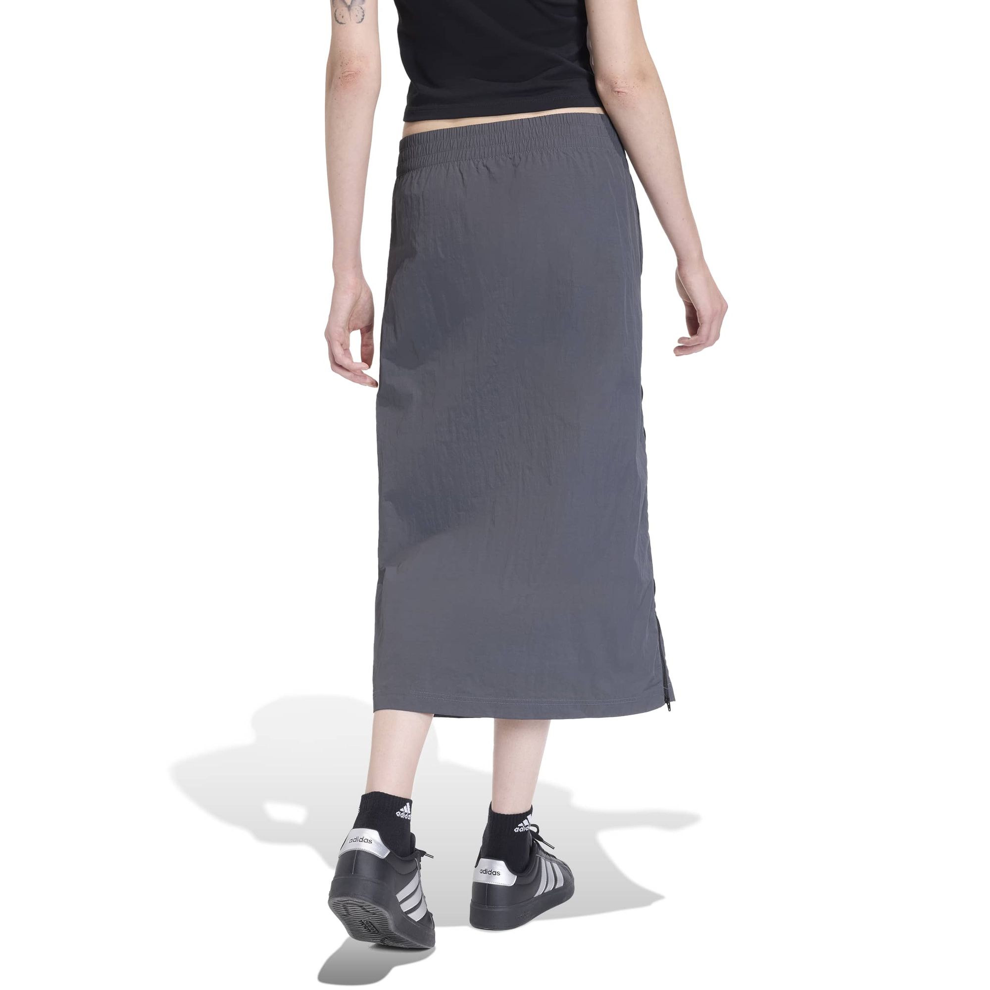 Ein seitlicher Reißverschlussbesatz verleiht dem Rock ein sportlich inspiriertes Detail, während das gummierte 3-Balken Logo-Print auf der Vorderseite den Look mit der Energie von adidas unterstreicht.