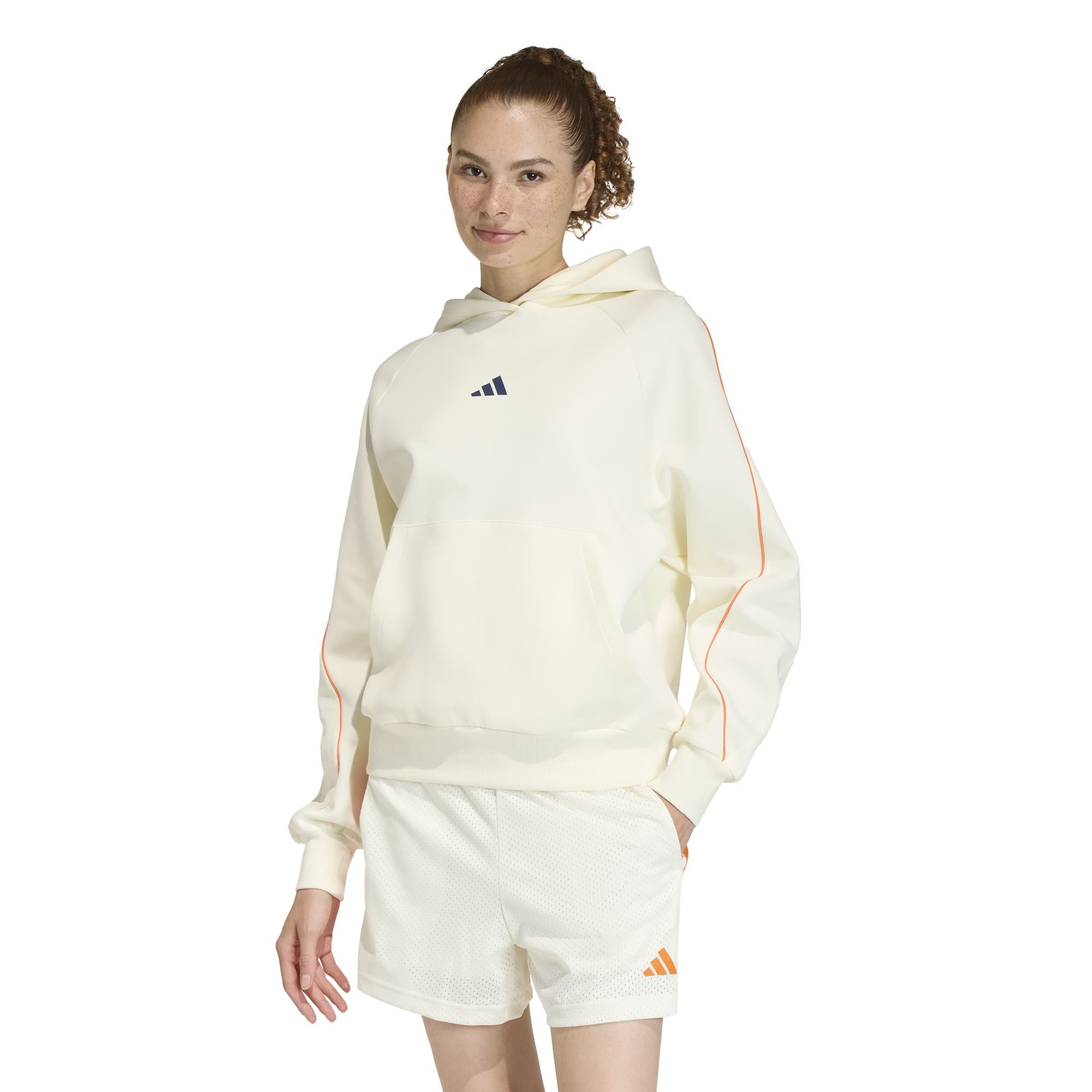 Die Satinpaspelierung setzt elegante Akzente, während die Kängurutasche praktischen Stauraum bietet. Dieser Hoodie verbindet die adidas Identität mit sportlichem Spirit und sorgt für selbstbewussten Komfort im Alltag.
