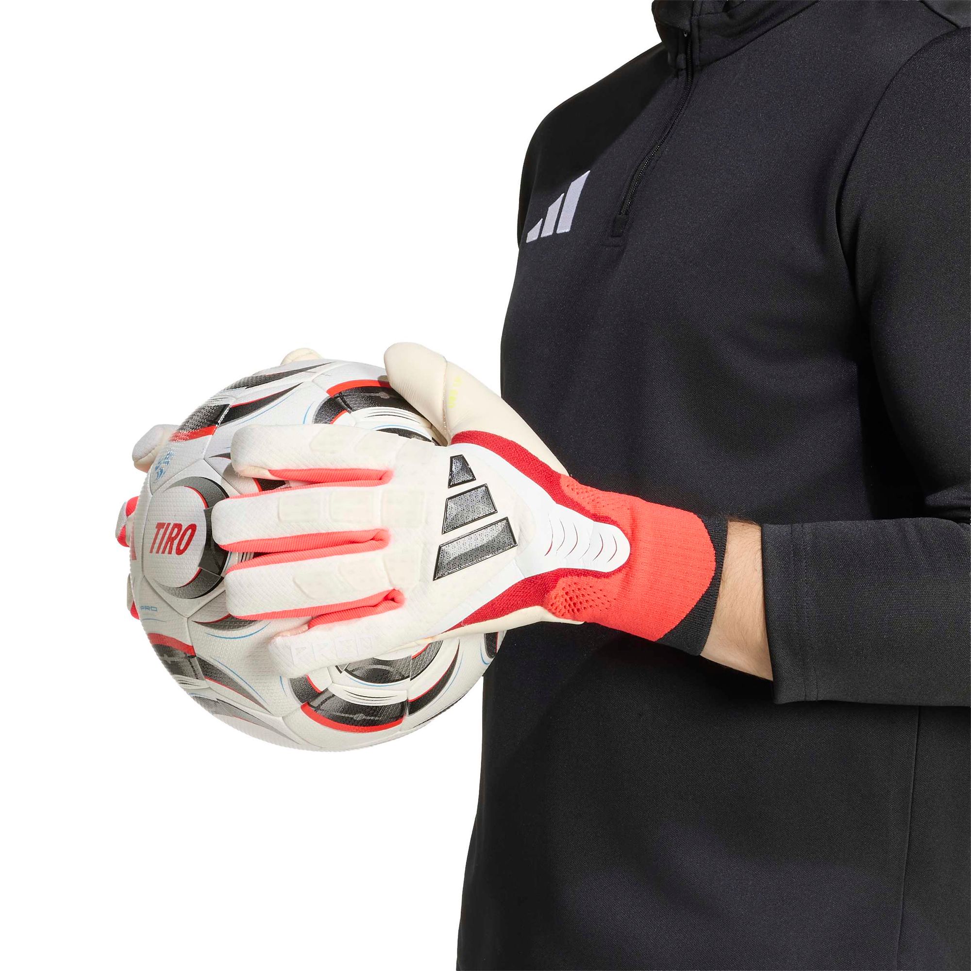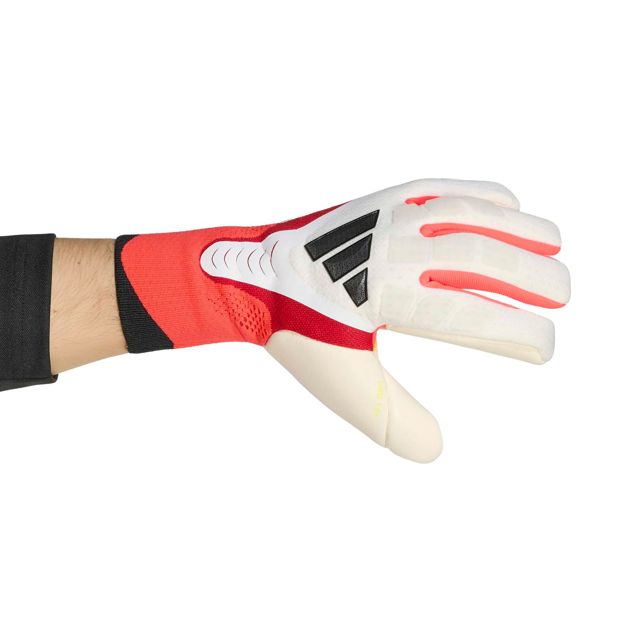 Der Positivschnitt sorgt für einen bequemen, eng anliegenden Sitz und eine große Ballkontaktfläche, damit du entscheidende Paraden souverän meisterst. Die Soft Grip Latex-Handfläche garantiert zuverlässigen Grip und hohe Strapazierfähigkeit bei unterschiedlichsten Wetterbedingungen. Dank des belüfteten Bündchens mit Schlitz am Handgelenk genießt du mehr Bewegungsfreiheit und kannst mühelos hinein- und herausschlüpfen – so bist du jederzeit einsatzbereit.