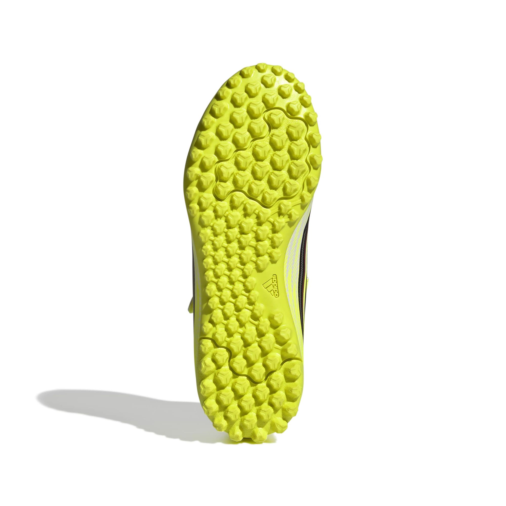 Die Turf-Außensohle wurde für Kunstrasenplätze entwickelt und bietet mehr Grip und Stabilität. Mit den elastischen Schnürsenkeln und dem Klettverschluss können deine Kleinen die Schuhe beim Spielen schnell wechseln.