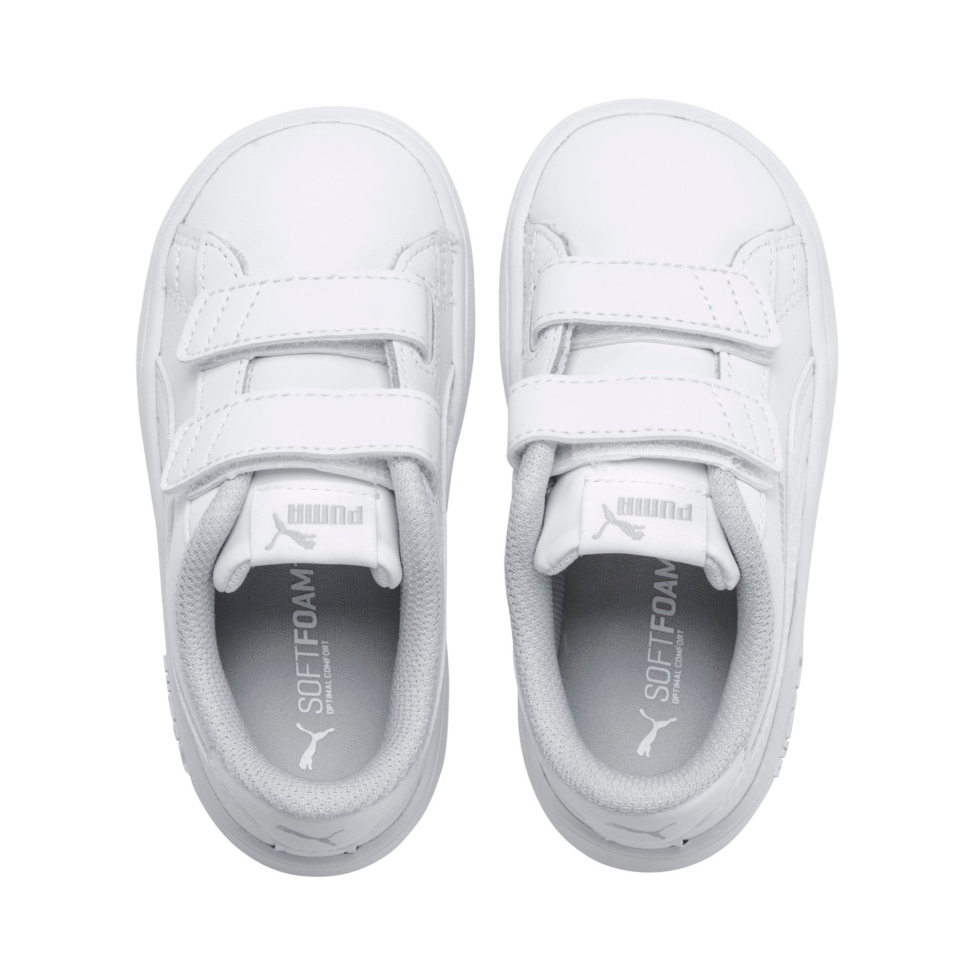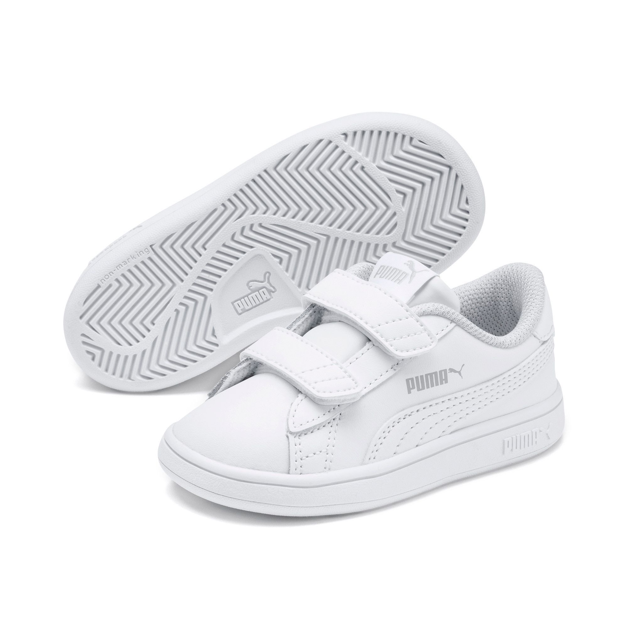 Dieser PUMA Smash v2 aus Leder ist die coole Kinderversion unseres kultigen Schuhs. Weiches Leder in optimierter Passform macht die ersten Gehversuche zu einer komfortablen Sache. Während das vom Tennis inspirierte Obermaterial für cleanen Style sorgt, zeichnet sich die nicht abfärbende Sohle durch Griffigkeit und Langlebigkeit aus.