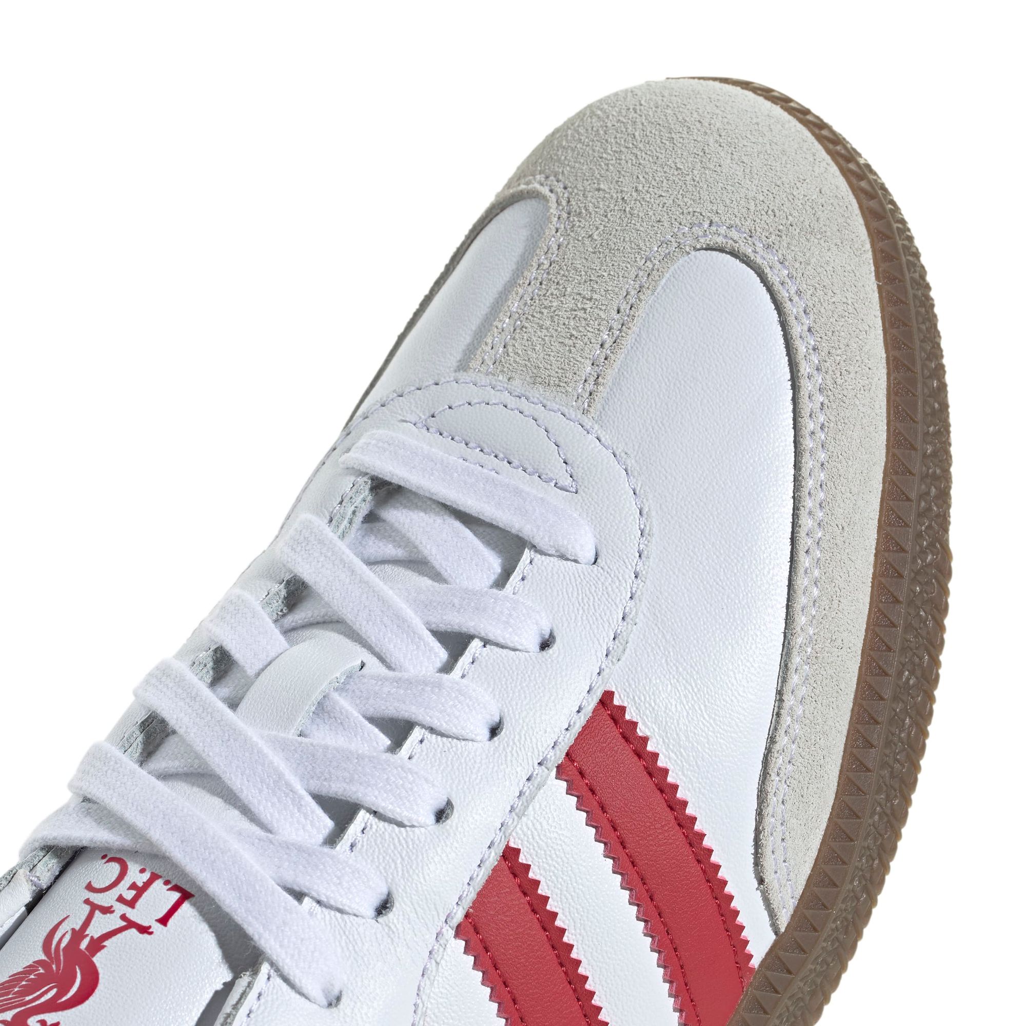 Für alle Reds-Fans, die auch abseits des Spielfelds ihren coolen Fußball-Style zeigen wollen. Der Samba ist eine Ikone unter den adidas Schuhen und berühmt für sein weiches Obermaterial aus Leder und den T-förmigen Zehenbereich aus Wildleder. Dieses Paar ist in den Auswärtsfarben des FC Liverpool gehalten und zeigt ein Vereinslogo auf dem Detail im Fersenbereich, damit jeder weiß, für welches Team dein Herz schlägt.