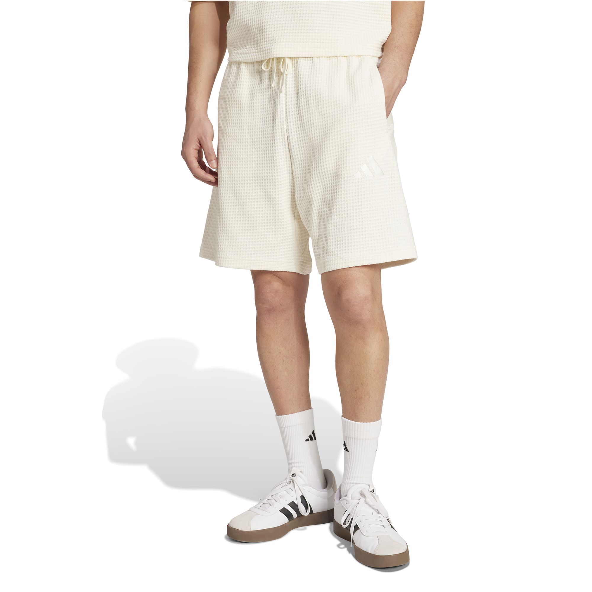 Diese adidas Shorts sind wie gemacht für entspannte Momente. Der leichte Waffelstrick sorgt für einen lässigen Vibe. Mit ihrem lockeren Schnitt und einer Länge von 18 cm passen die Shorts zu jedem Look. Ein elastischer Bund mit Kordelzug und Seitentaschen runden das Design ab und ein Ton in Ton gehaltenes 3-Streifen-Logo sorgt für das Signature-Finish.