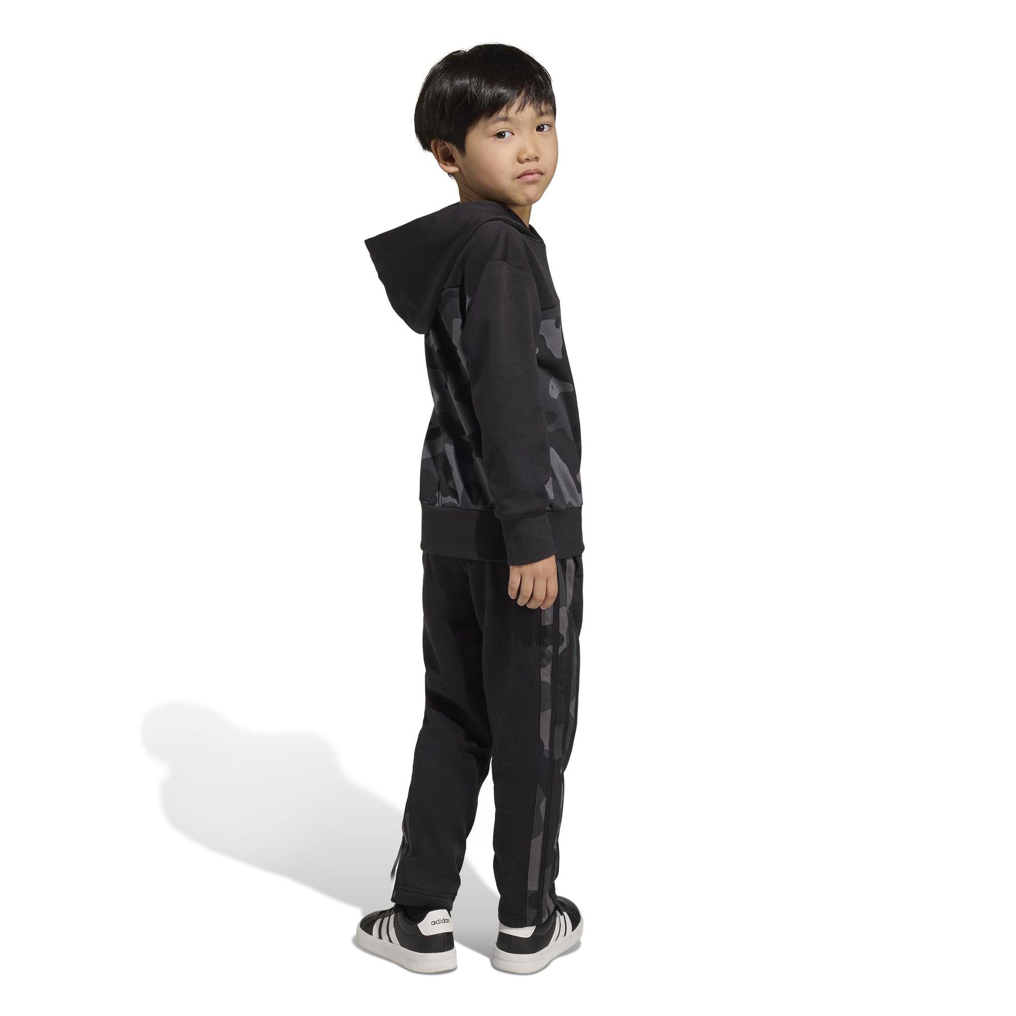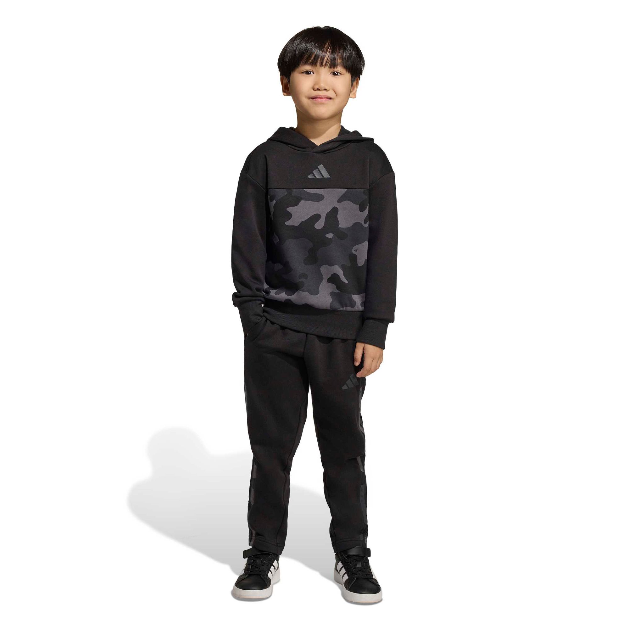 Dieses Adidas Joggingset ist für aktive Kinder gemacht. Das Fleece hält sie unterwegs kuschelig warm, während der Camouflage-Print ihren Alltagsabenteuern eine witzige Note verleiht. Kombiniere Hoodie und Jogginghose mit anderen Lieblingsteilen für einen lässigen, sportlichen Look.
