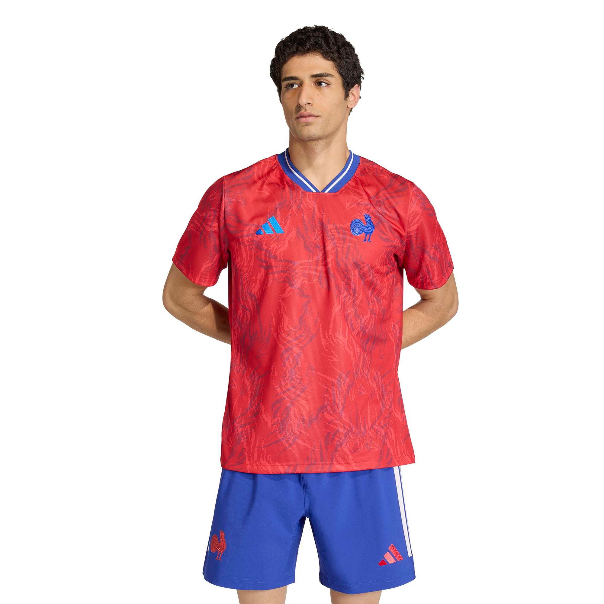 Betritt mit Stolz das Spielfeld im Frankrech Rugby Prematch Jersey. Inspiriert von dem leuchtenden Rot der französischen Flagge und der symbolischen Hahnenfeder, spiegelt dieses Jersey den Geist des Nationalteams wieder. Egal, ob du dich vor dem Spiel aufwärmst oder dein Team von der Tribüne aus anfeuerst, dieses Jersey sorgt dafür, dass du es bequem und trocken hast.