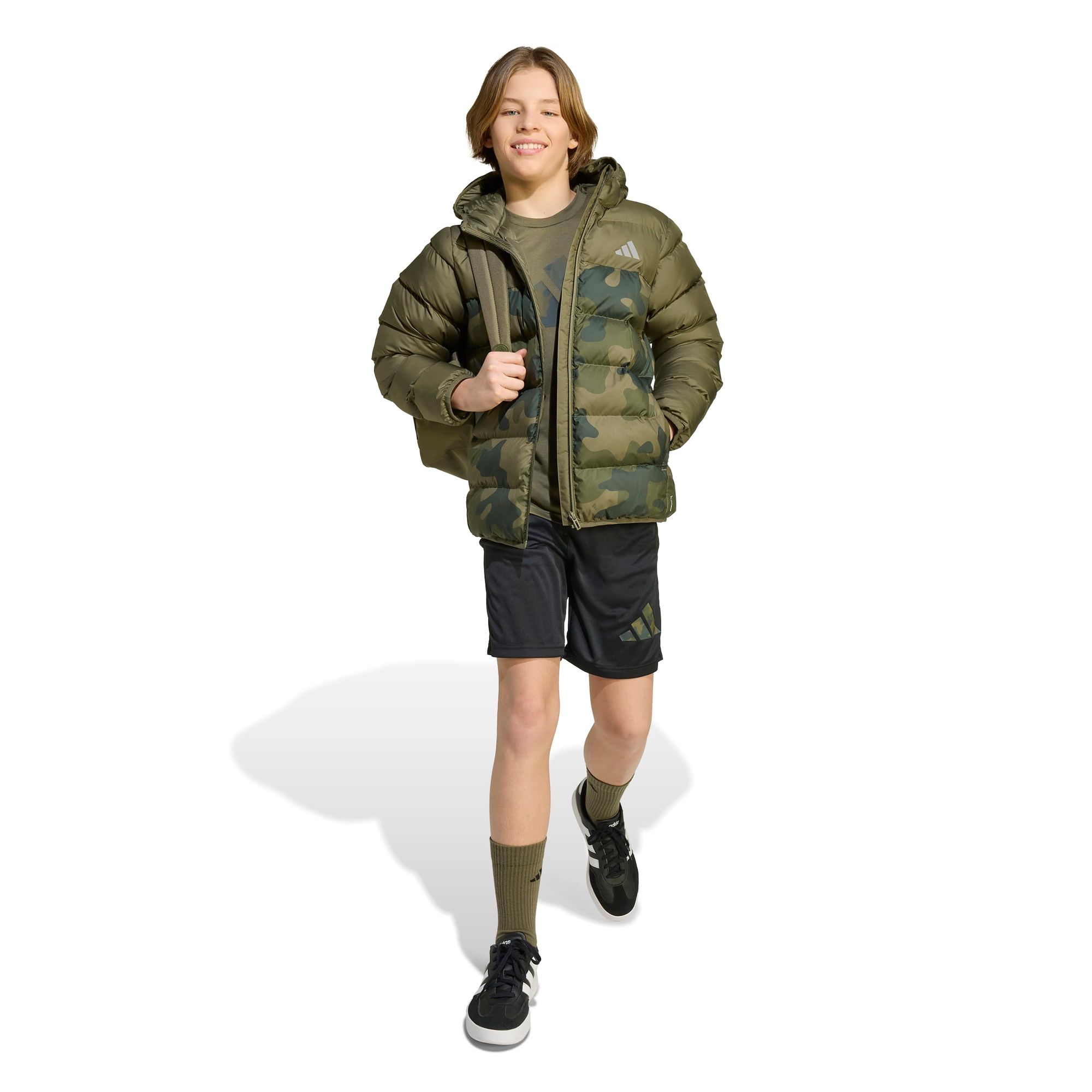 Wenn die Temperaturen sinken, hält dich diese synthetische Daunenjacke für Junioren von adidas kuschelig warm. Die bauschige Isolierung speichert die Wärme, und die gefütterte Kapuze bietet zusätzlichen Schutz. Diese Jacke besticht durch dezenten Style mit einem tonalen Camouflage-Print auf der Vorderseite und einem reflektierenden Logo auf der Brust. CLIMAWARM speichert Wärme und leitet Schweiß ab – für warme, trockene und konzentrierte Performance. Isolierende Materialien speichern die Wärme für optimale Körpertemperatur. Trotze den Elementen mit Wärmeisolierung und wasserabweisender Ausrüstung für optimalen Schutz der Außenschicht.
