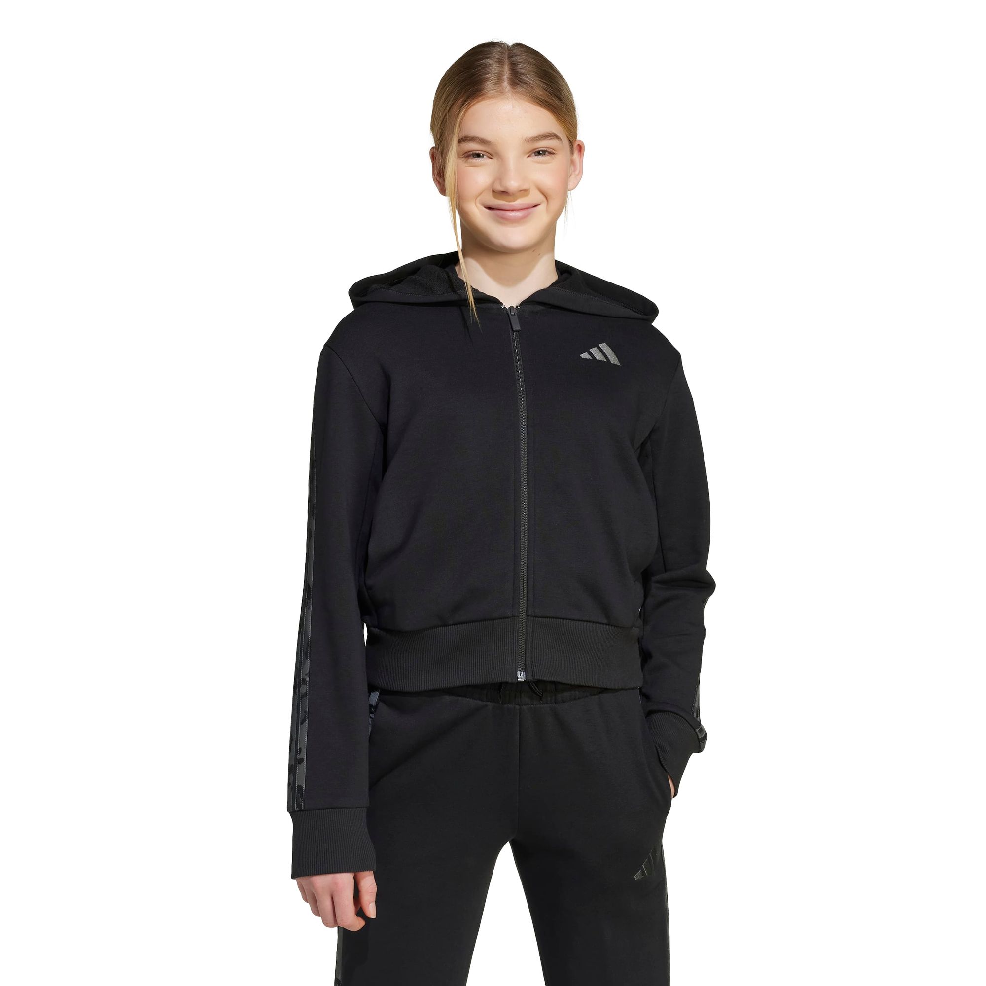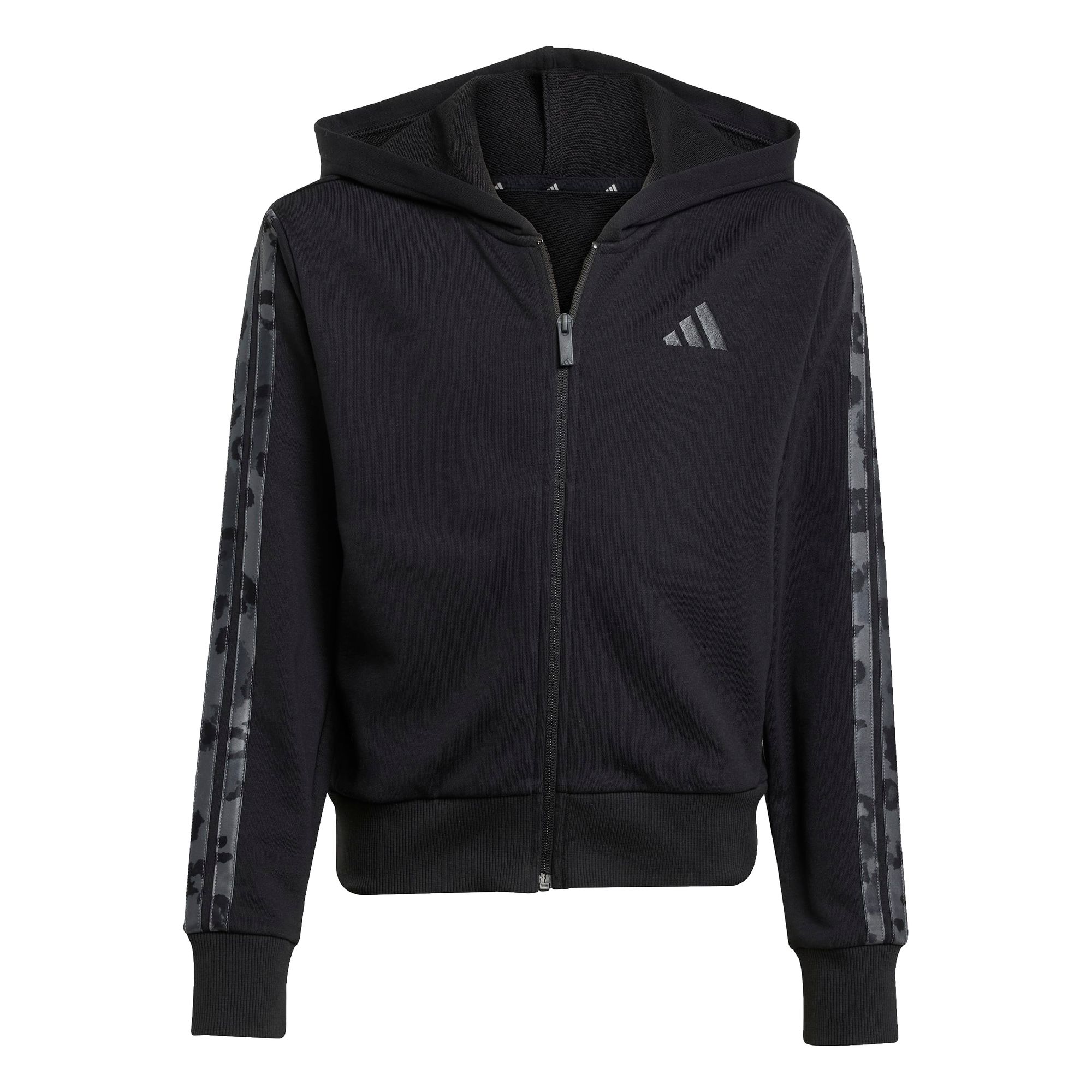 Diese adidas Trainingsjacke für Kinder ist ein Muss für jeden Tag. Sie ist aus einer Baumwollmischung aus French Terry gefertigt und hält den ganzen Tag lang warm. 3-Streifen mit Animalprint sorgen für ein verspieltes Finish.