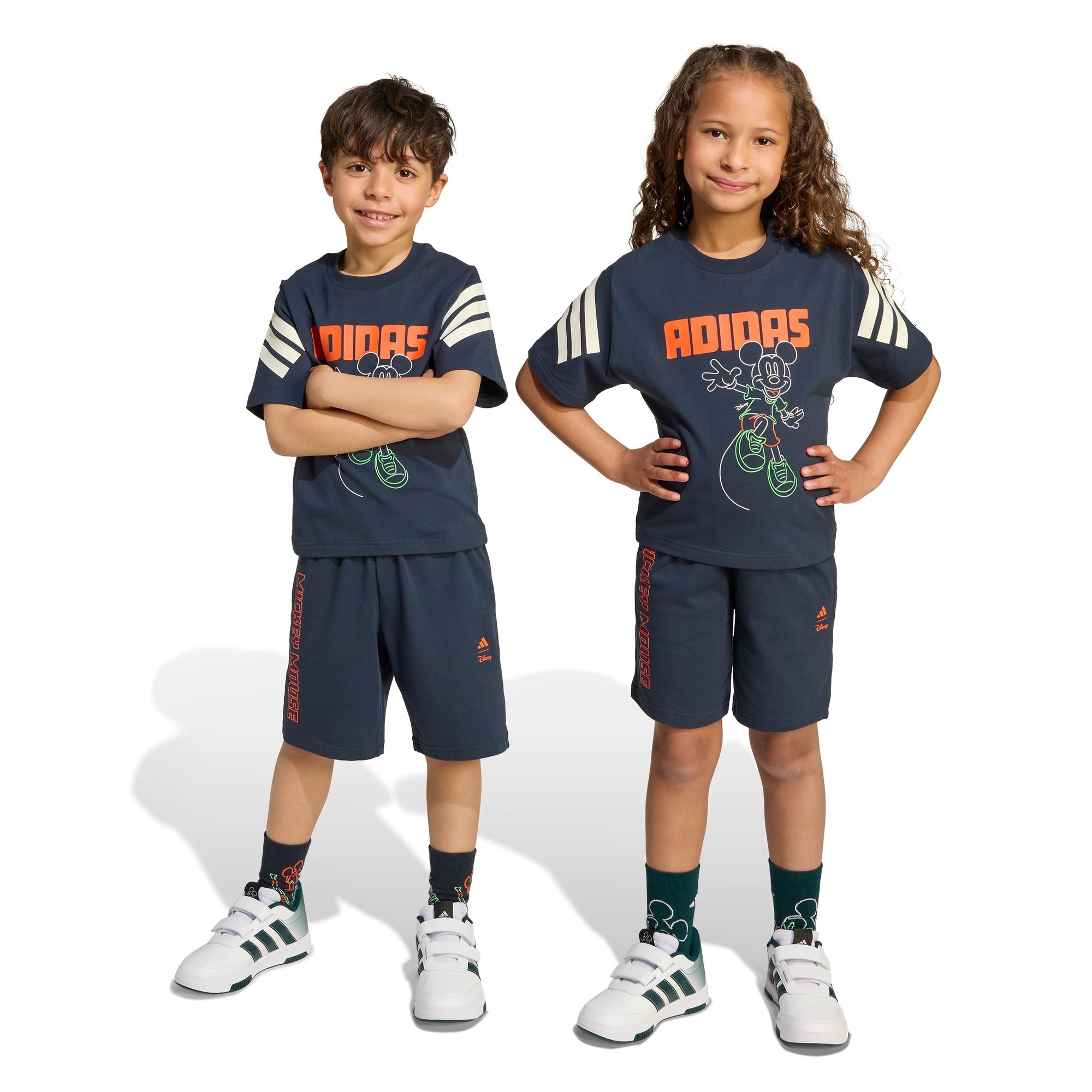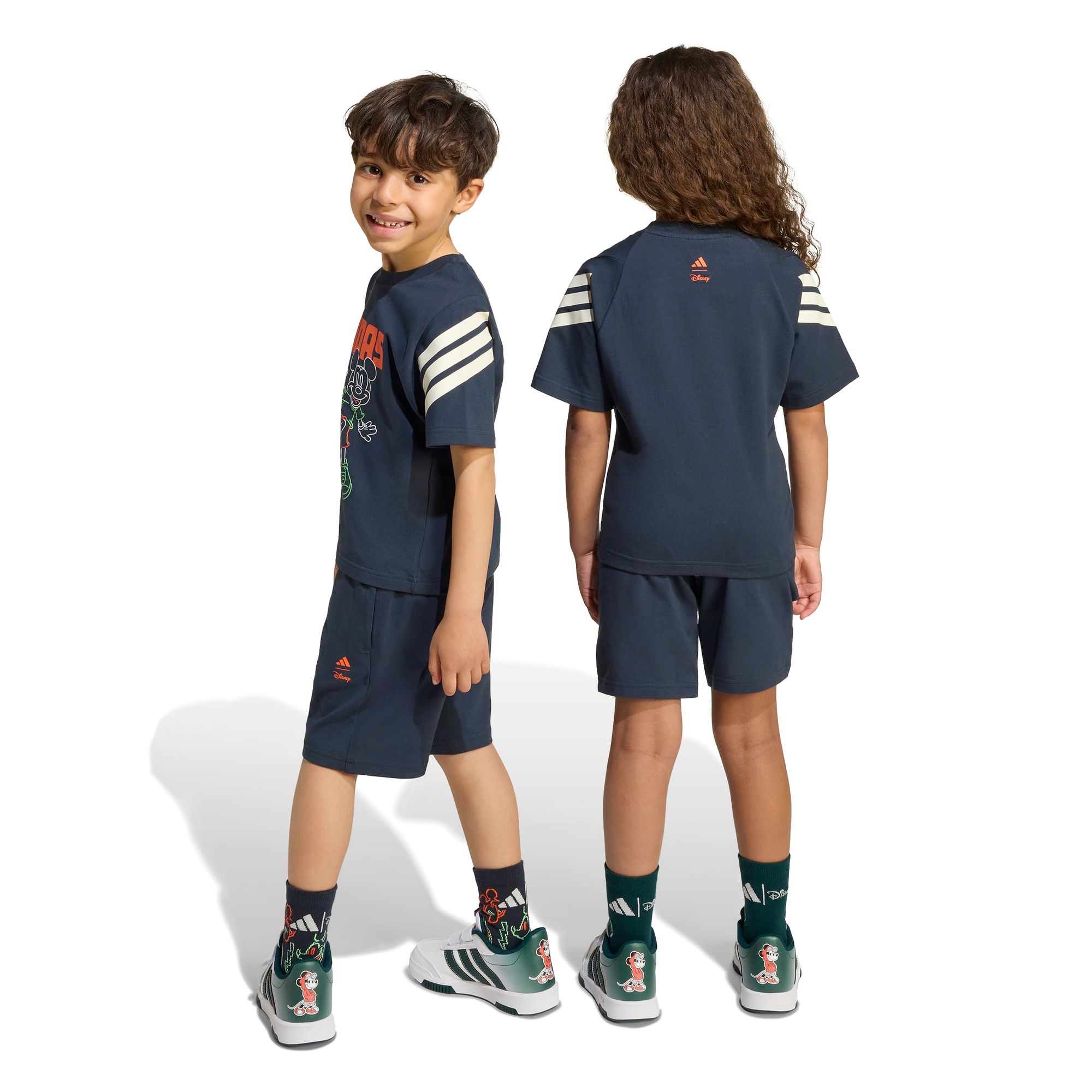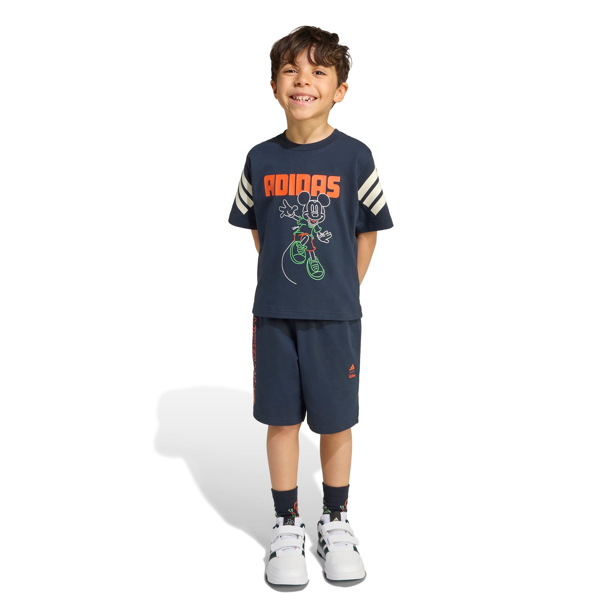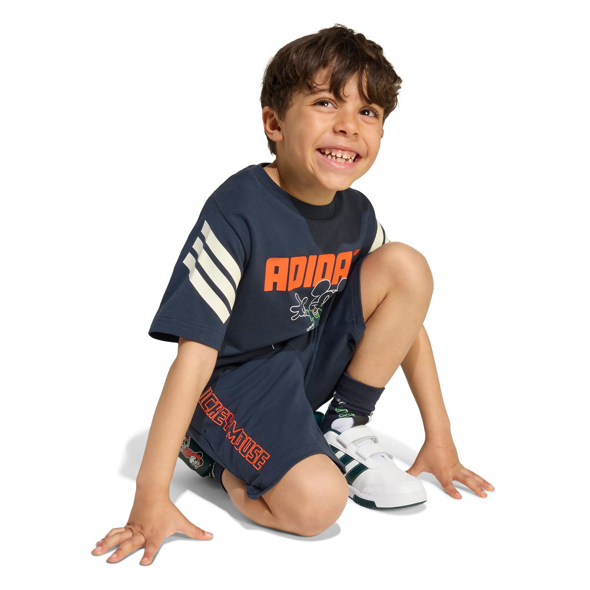 adidas hat sich mit Disney zusammengetan, um einen lustigen, sportlichen Look für Kinder zu kreieren. Dieses Set besteht aus einem T-Shirt mit Rundhalsausschnitt aus einem dehnbaren Baumwollmix und mittelhohen Shorts mit elastischem Bund. Ob auf dem Schulhof oder im Garten, die Kinder werden die leuchtende Micky Maus-Grafik in Kombination mit den fett gedruckten Buchstaben und den kultigen 3-Streifen von adidas lieben.