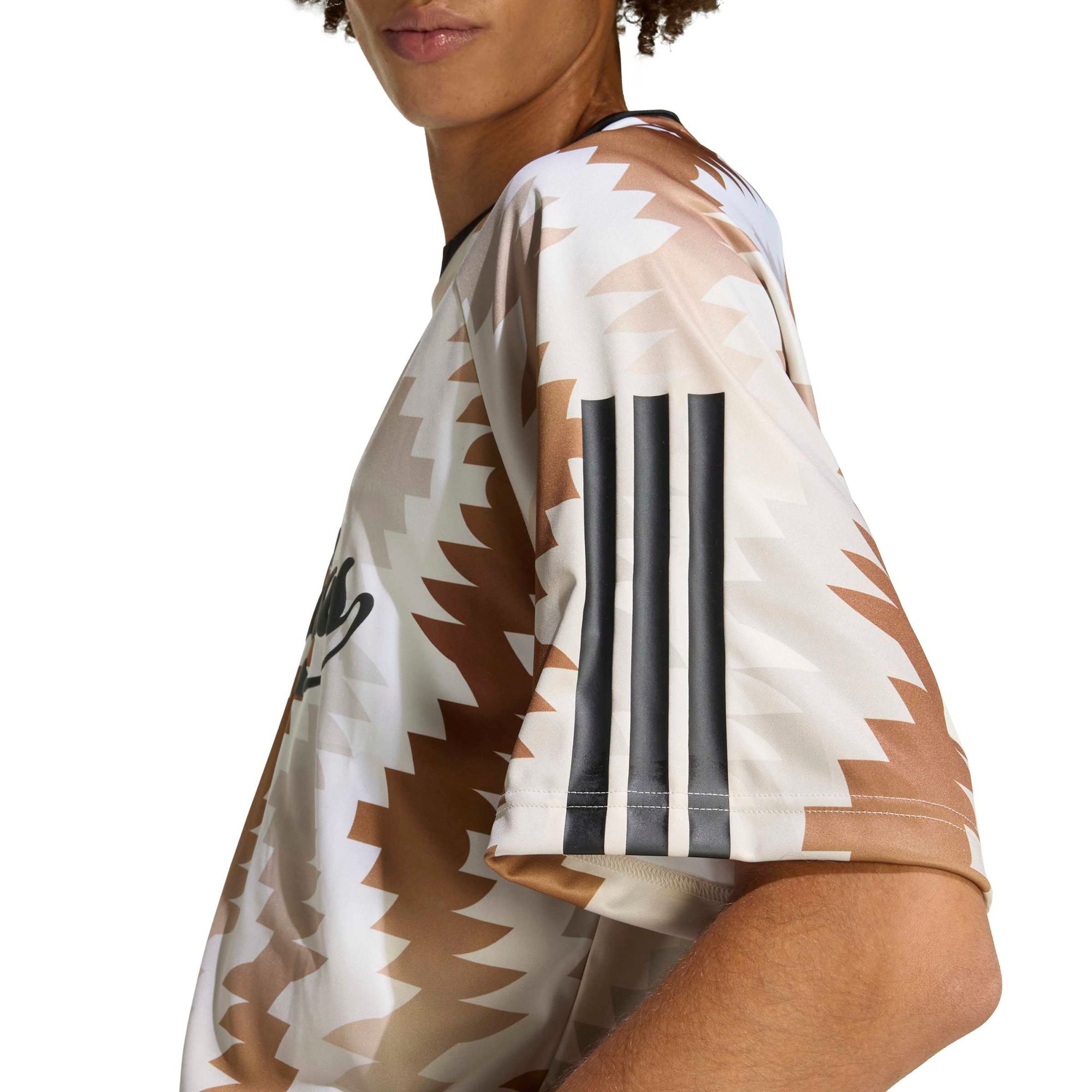Das House of Tiro x Common Goal Trikot ist mehr als nur ein Kleidungsstück; es ist ein Fest der Gemeinschaft und Kultur. Dieses Trikot entstand aus einer Zusammenarbeit mit Common Goal und Fútbol Más und soll den lokalen Stolz mit der globalen Gemeinschaft verbinden. Das Allover-Print ist von Mexikos lebendigen Fußballgemeinden inspiriert und das adidas sportswear x Common Goal Flaggenlabel im Inneren steht für das Engagement, durch Sport sichere Räume für Kinder zu schaffen. Mit seiner lockeren Passform und dem vom Fußball inspirierten Rippenkragen bietet dieses Trikot gleichermaßen Komfort und Stil. Das adidas Puffer-Wortzeichen auf der Brust rundet den Look ab. Egal, ob du auf dem Spielfeld oder auf der Tribüne stehst, mit diesem Trikot kannst du ein Zeichen setzen. Zeige die universelle Kraft des Fußballs und verinnerliche den Geist des Spiels mit adidas und sei Teil von etwas Größerem.